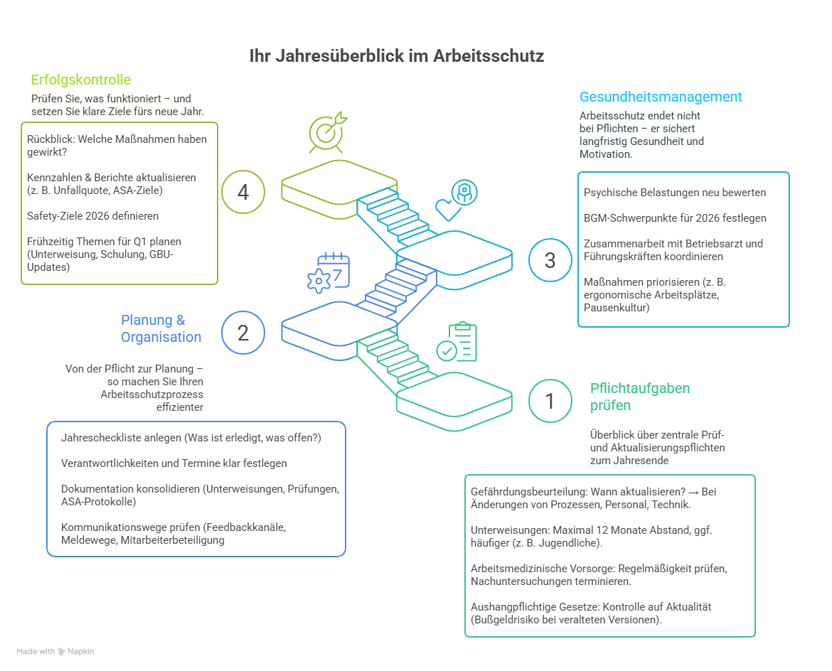 Diese Übersicht zeigt Ihnen, welche Themen Sie im Arbeitsschutz jetzt prüfen sollten – und in welcher Reihenfolge Sie sie am besten angehen.