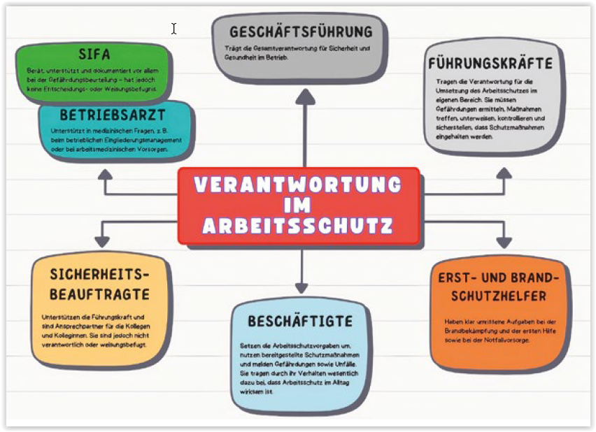 Wenn es um Aufgaben und Verantwortung im Arbeitsschutz geht, gibt es viele Beteiligte. Wichtig ist, dass alle, und zwar wirklich alle Akteure, ihre Aufgaben kennen und wahrnehmen. Nutzen Sie unsere Infografik, um den Teilnehmenden einen kurzen Überblick über die wichtigsten Akteure und ihre Aufgaben zu geben.